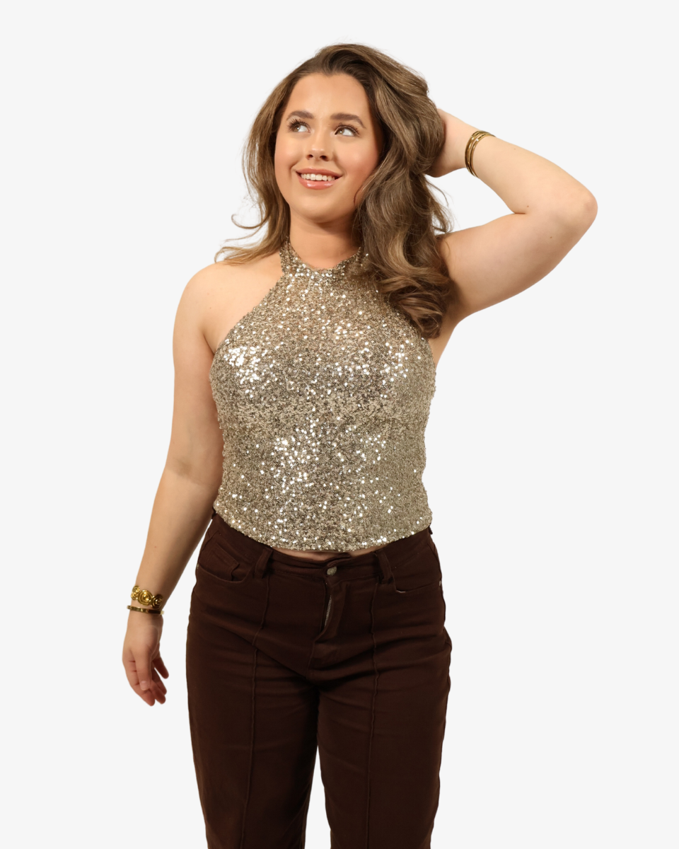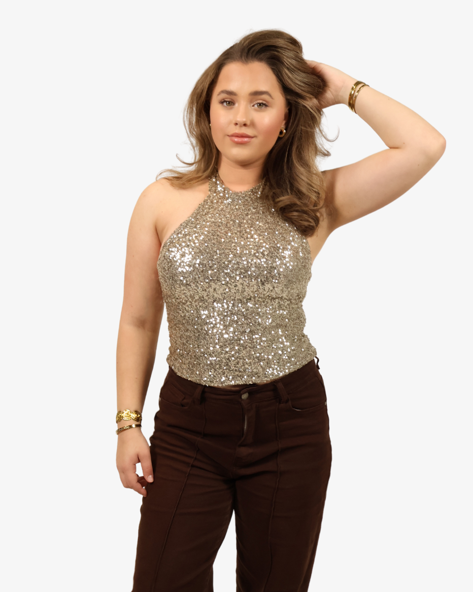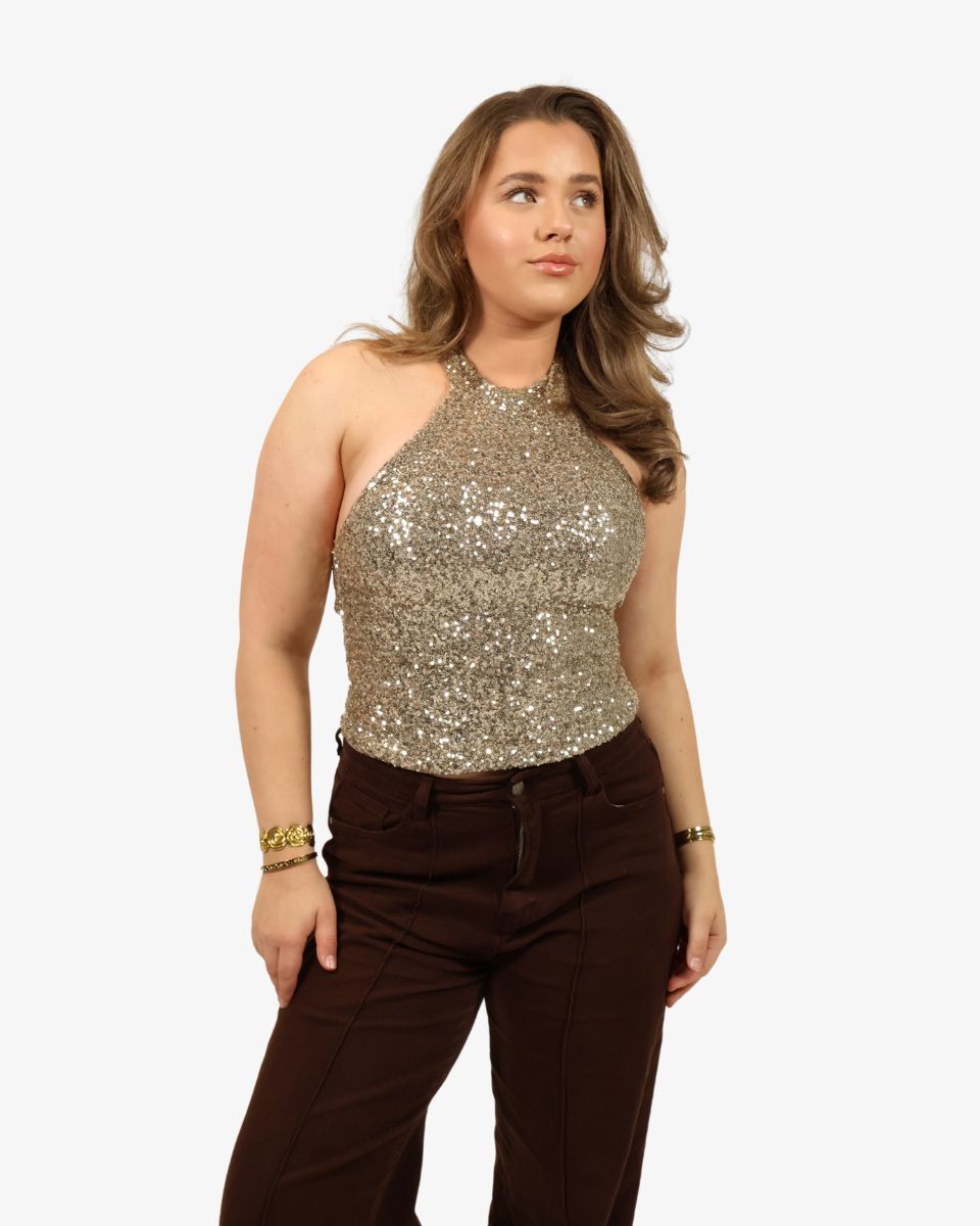 De Belle Top is een echte party must-have. Deze haltertop is volledig bedekt met pailletten die schitteren bij elke beweging — perfect voor een avond vol sparkle. De flatterende pasvorm en open halslijn geven een elegante, vrouwelijke look met een speelse touch.