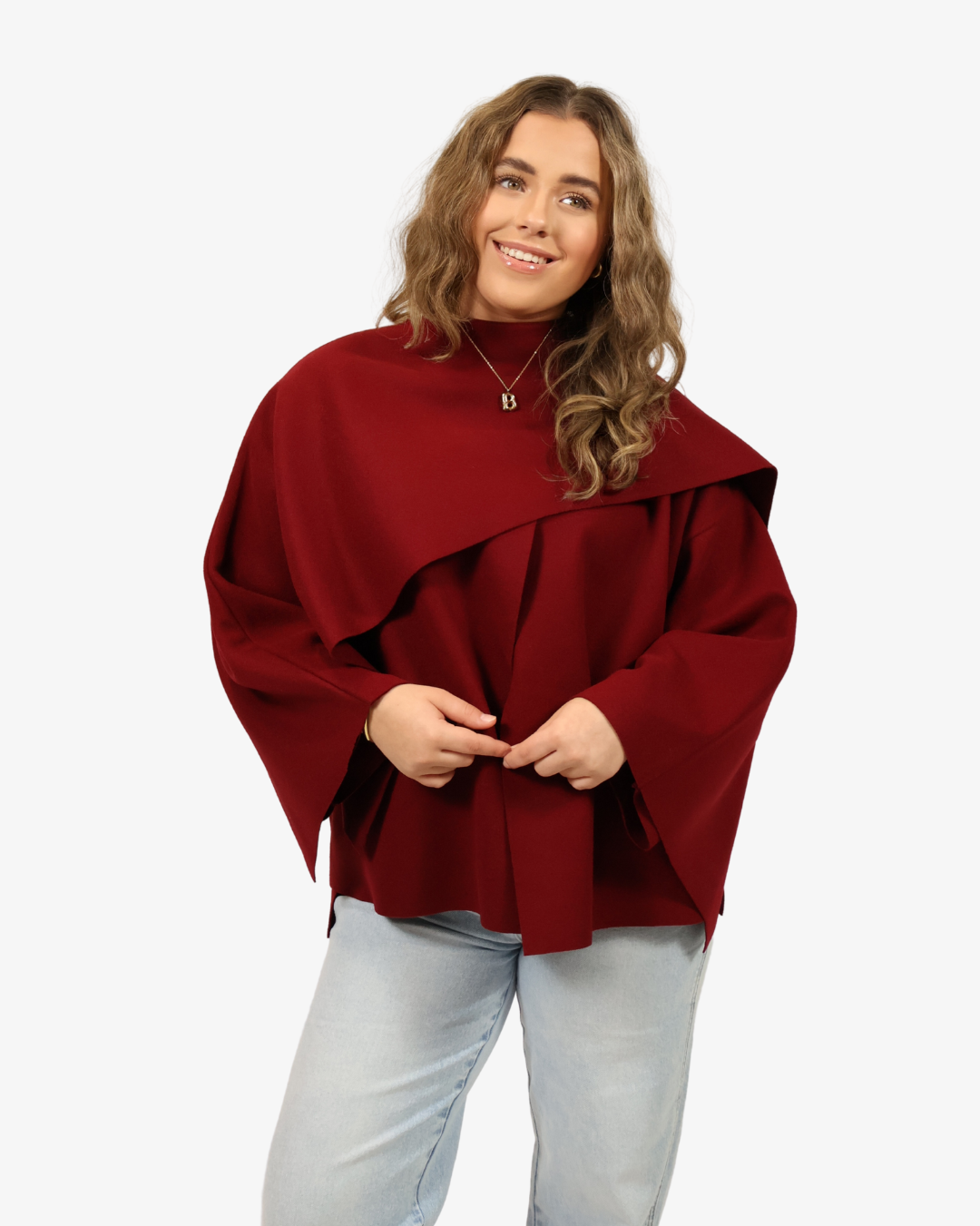 Het Cape Jacket Bordeaux is elegant en opvallend. Deze bordeauxrode jas heeft een losse, cape-achtige pasvorm en geeft je outfit een stijlvolle, effortlessly chic uitstraling.