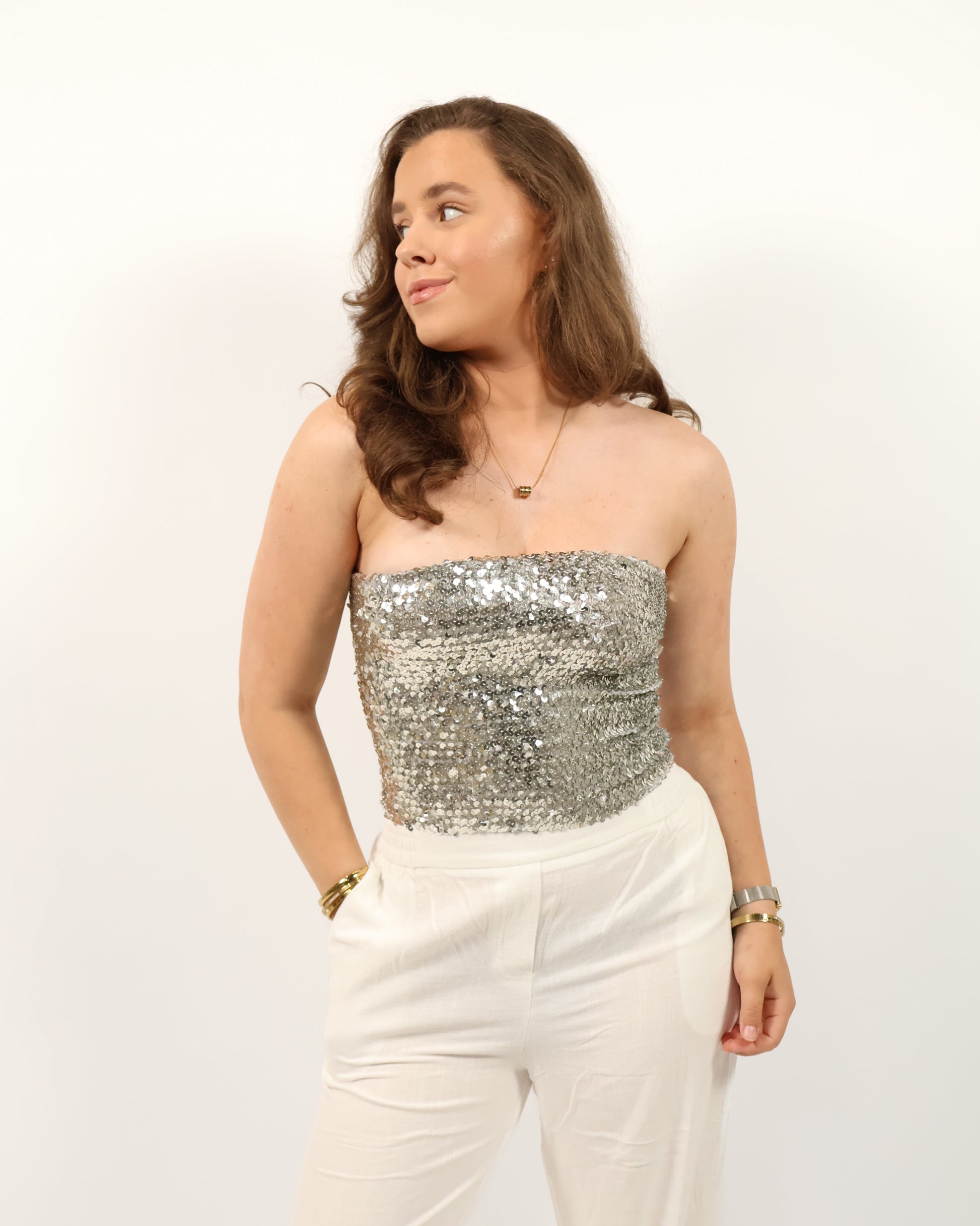 Shine all day & night met de Evy Top in sprankelend zilver! Deze one size top is bezaaid met pailletten, heeft een comfy fit en voegt meteen feestelijke flair toe aan elke look. Perfect voor een avondje uit of als eyecatcher bij een casual outfit.