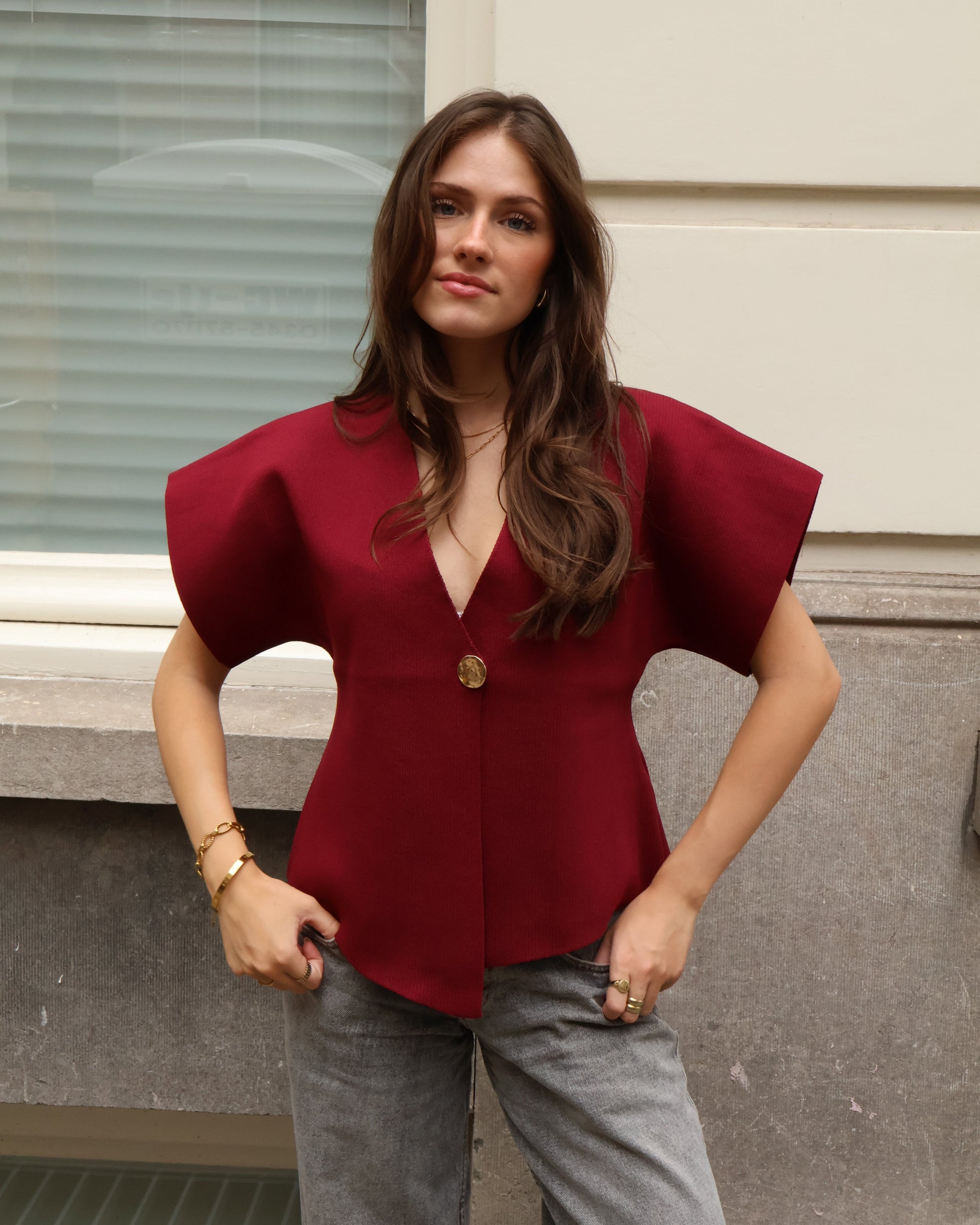 Caia Top Bordeaux – Chique gilet-top in een diepe bordeaux tint, afgewerkt met een prachtige gouden knoop. Een stijlvolle eyecatcher die moeiteloos klasse en moderniteit combineert.